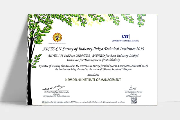 NDIM has been declared “Best Industry-Linked B-School of India” for 3 years in a row, by the AICTE, Ministry of HRD (Government of India) and the CII (Confederation of Indian Industry) after a Nationwide year long survey of all the 10,000+ technical and higher education AICTE approved institutions across India under 19 parameters. By virtue of Winning this award three years in a row, NDIM has been Elevated and Declared as the First and the only “Mentor Institute” in India in the Management category by the AICTE and CII”.